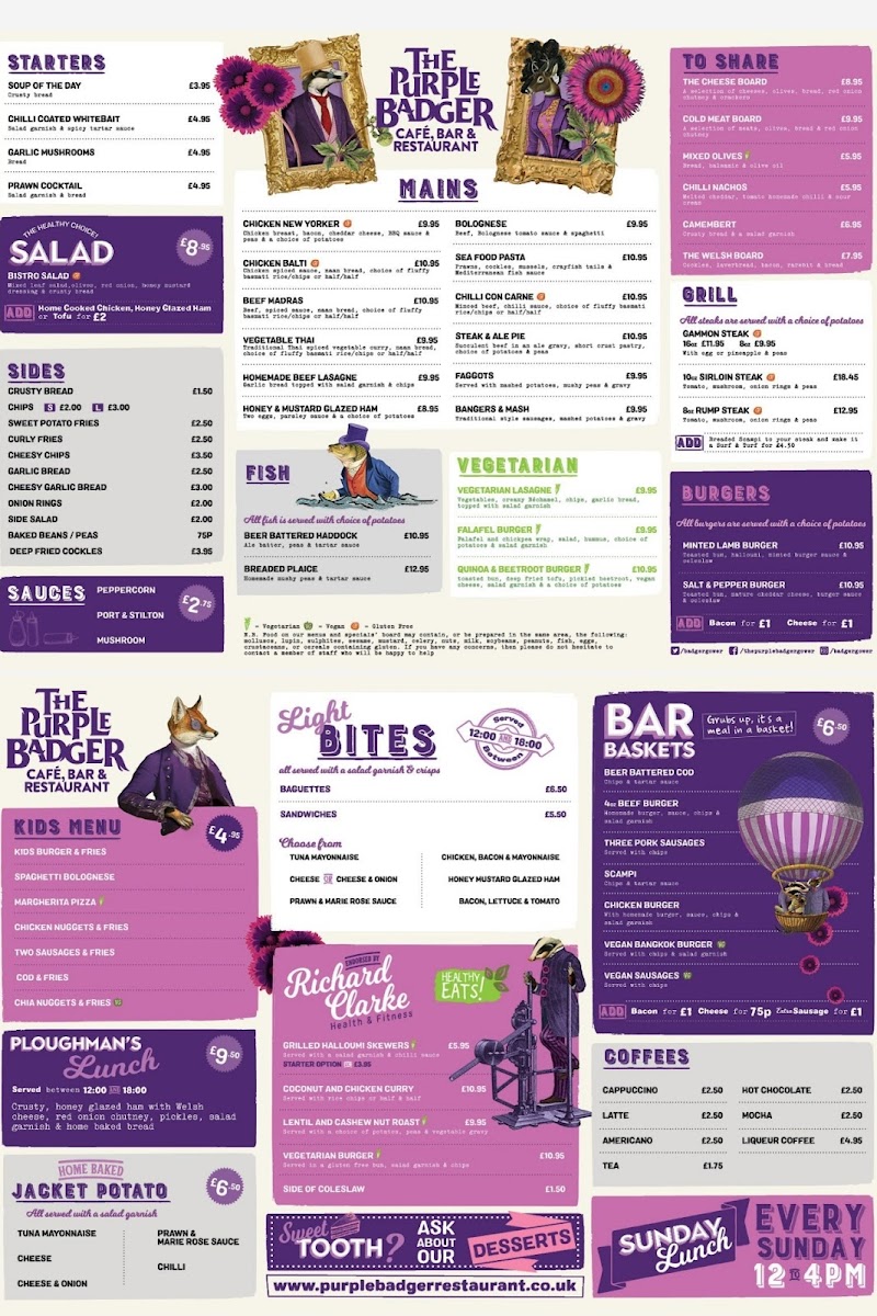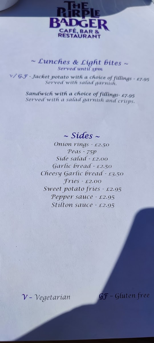 What sets The Purple Badger apart is the evident care in both preparation and presentation. Dishes arrive hot and well-seasoned, and service is consistently friendly, contributing to a relaxed, family-friendly environment. Prices remain reasonable for the quality offered-mains typically fall between £10-£15, with kids' meals and desserts priced accessibly.